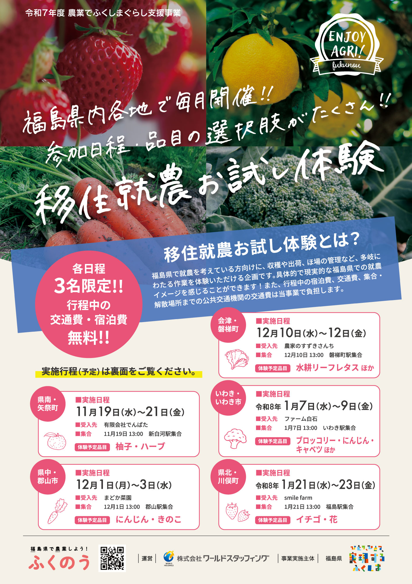 先日お知らせした、福島県への移住&就農を考えている方向けに、収穫や出荷、ほ場の管理など、多岐にわたる作業を体験いただける「移住就農お試し体験」の日程追加のお知らせです。