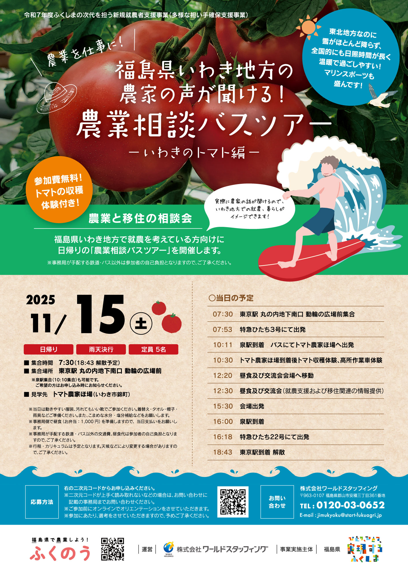 また、当日は就農や移住に関する支援情報の提供や交流会も予定しています。
