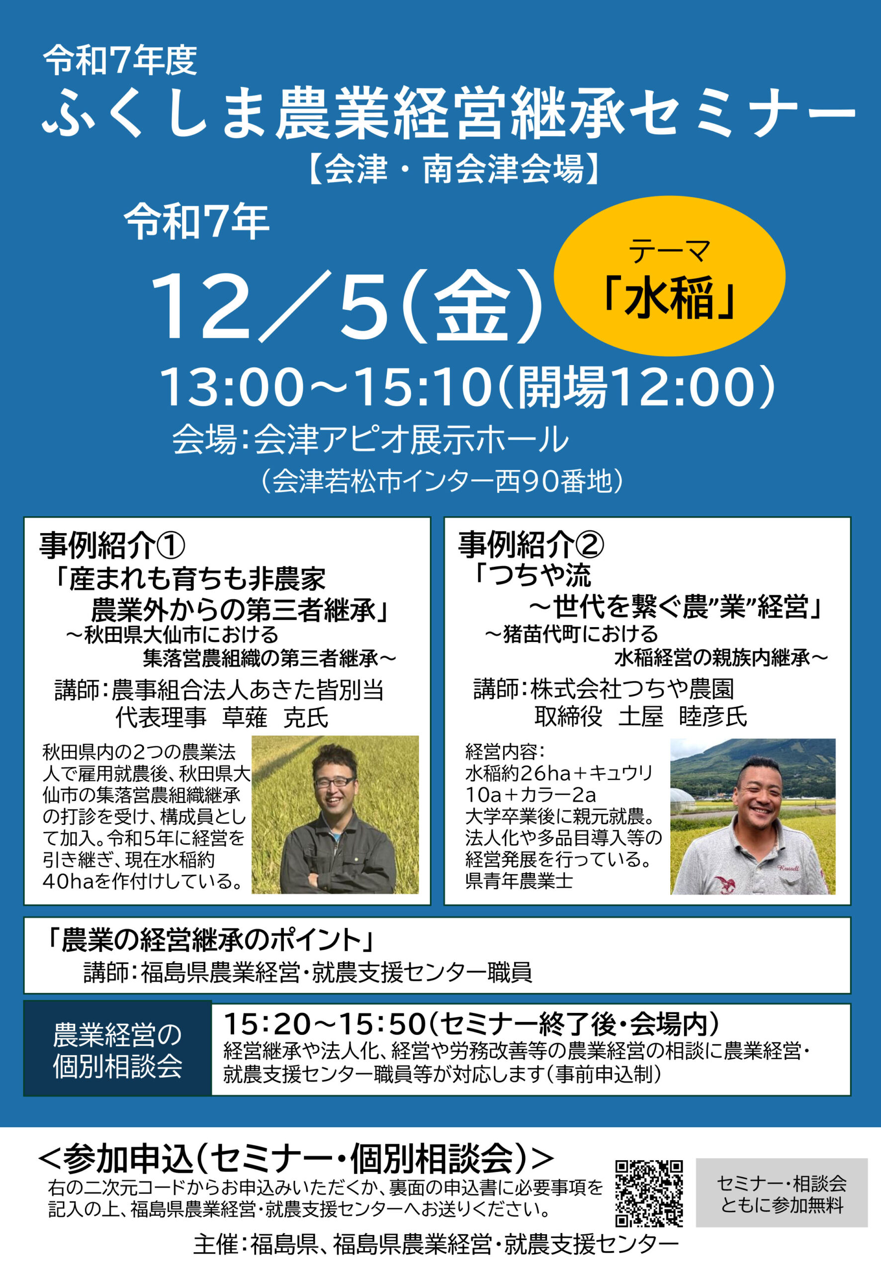【農業者向け・テーマ「水稲」/会津・南会津会場】12/5(金) 令和7年度ふくしま農業経営継承セミナーを開催します!