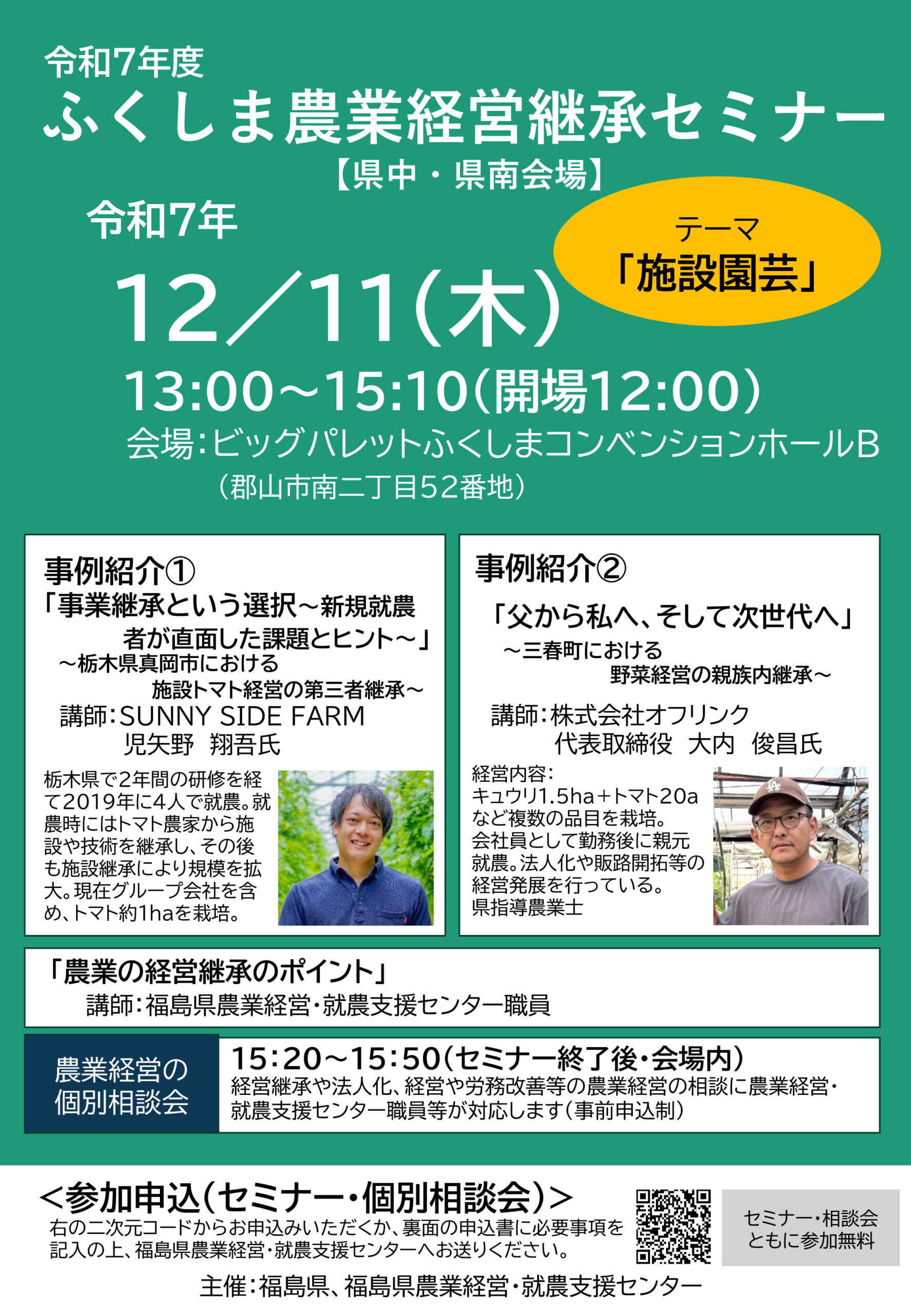 【農業者向け・テーマ「施設園芸」/県中・県南会場】12/11(木) 令和7年度ふくしま農業経営継承セミナーを開催します!