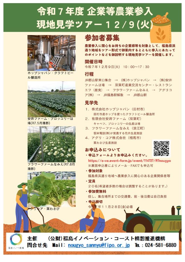 今日は、(公財)福島イノベーション・コースト構想推進機構主催「令和7年度企業等農業参入現地見学ツアー」開催のお知らせです。