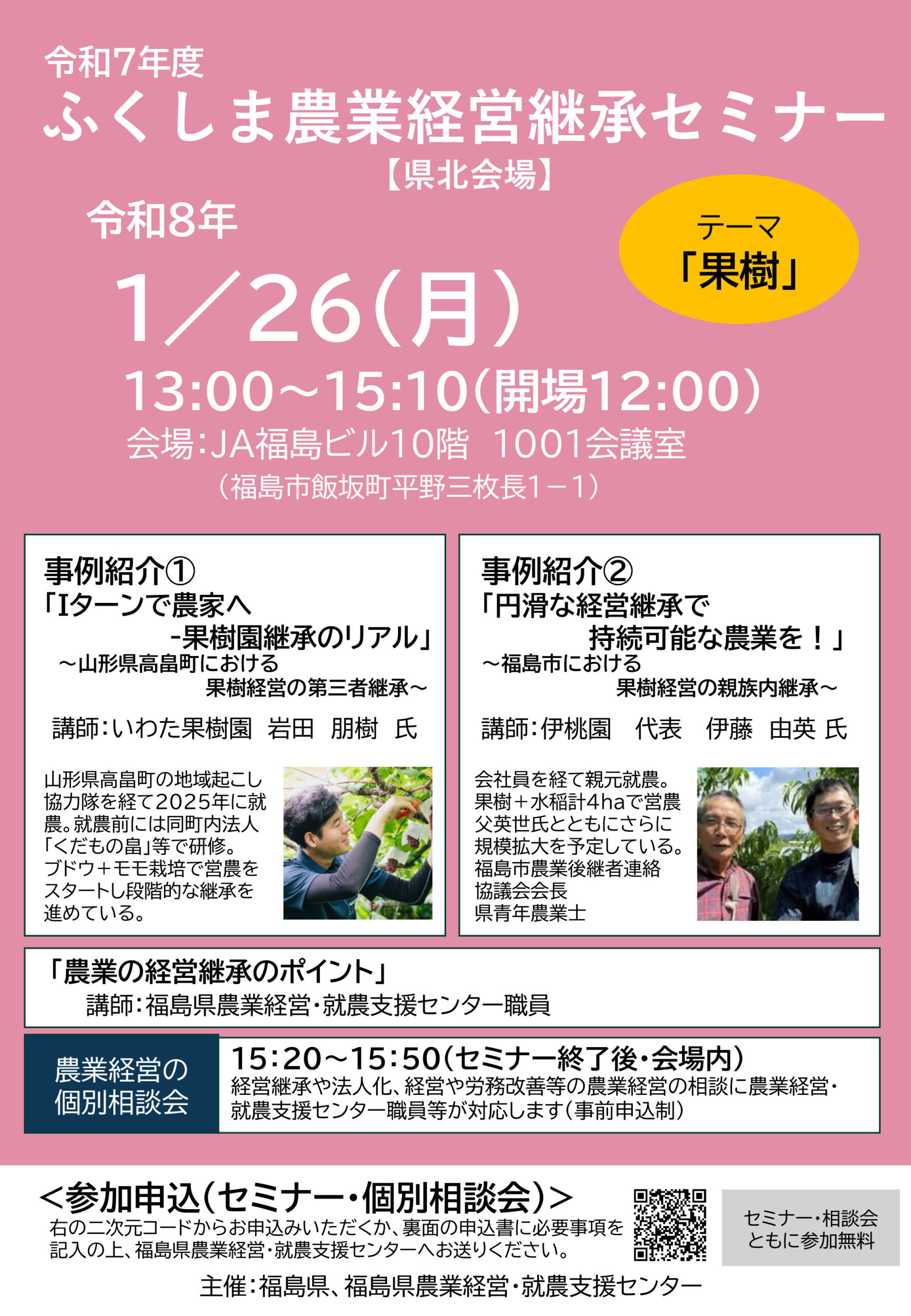 【農業者向け・テーマ「果樹」/県北会場】1/26(月) 令和7年度ふくしま農業経営継承セミナーを開催します!