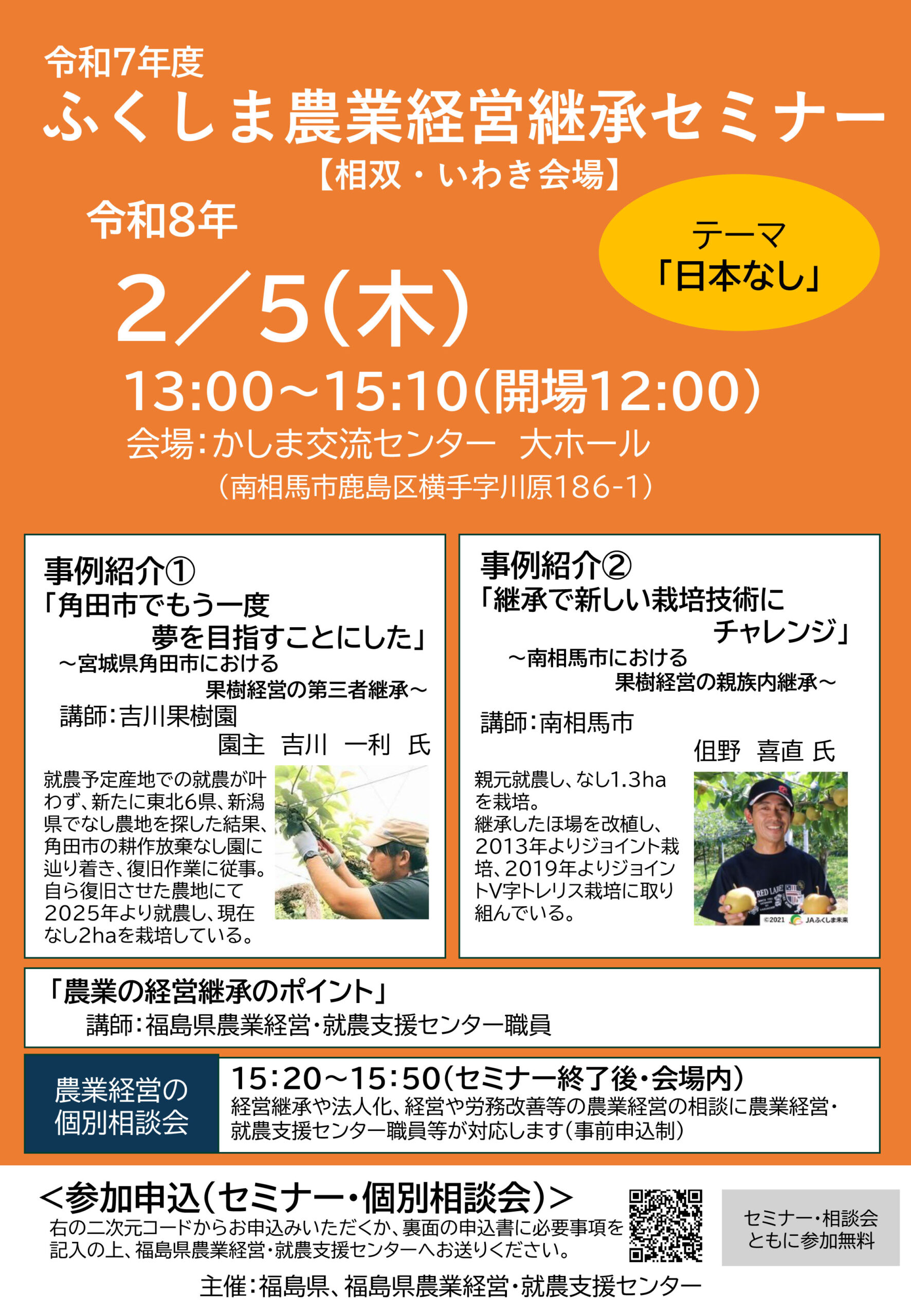【農業者向け・テーマ「日本なし」/相双・いわき会場会場】2/5(木) 令和7年度ふくしま農業経営継承セミナーを開催します!