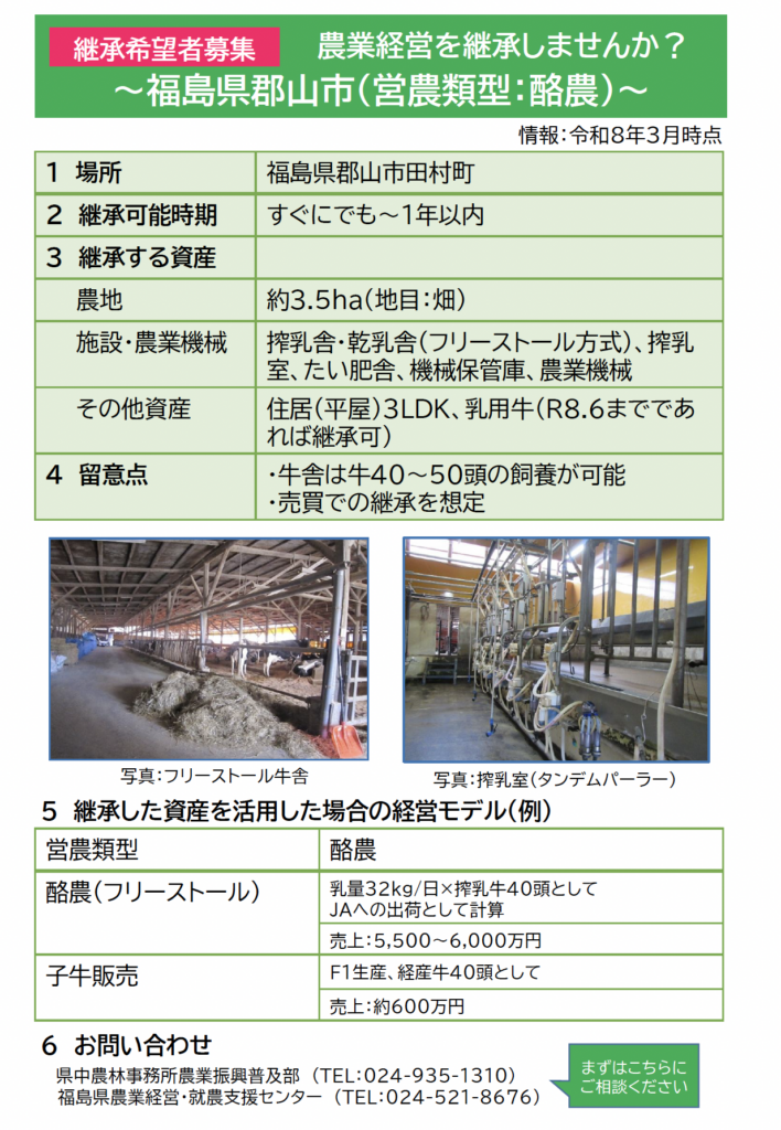 この度、郡山市田村町の酪農経営の方から継承者募集の依頼がありました。